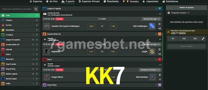 O KK7 oferece uma grande seleção de opções de apostas em e-sports com probabilidades competitivas